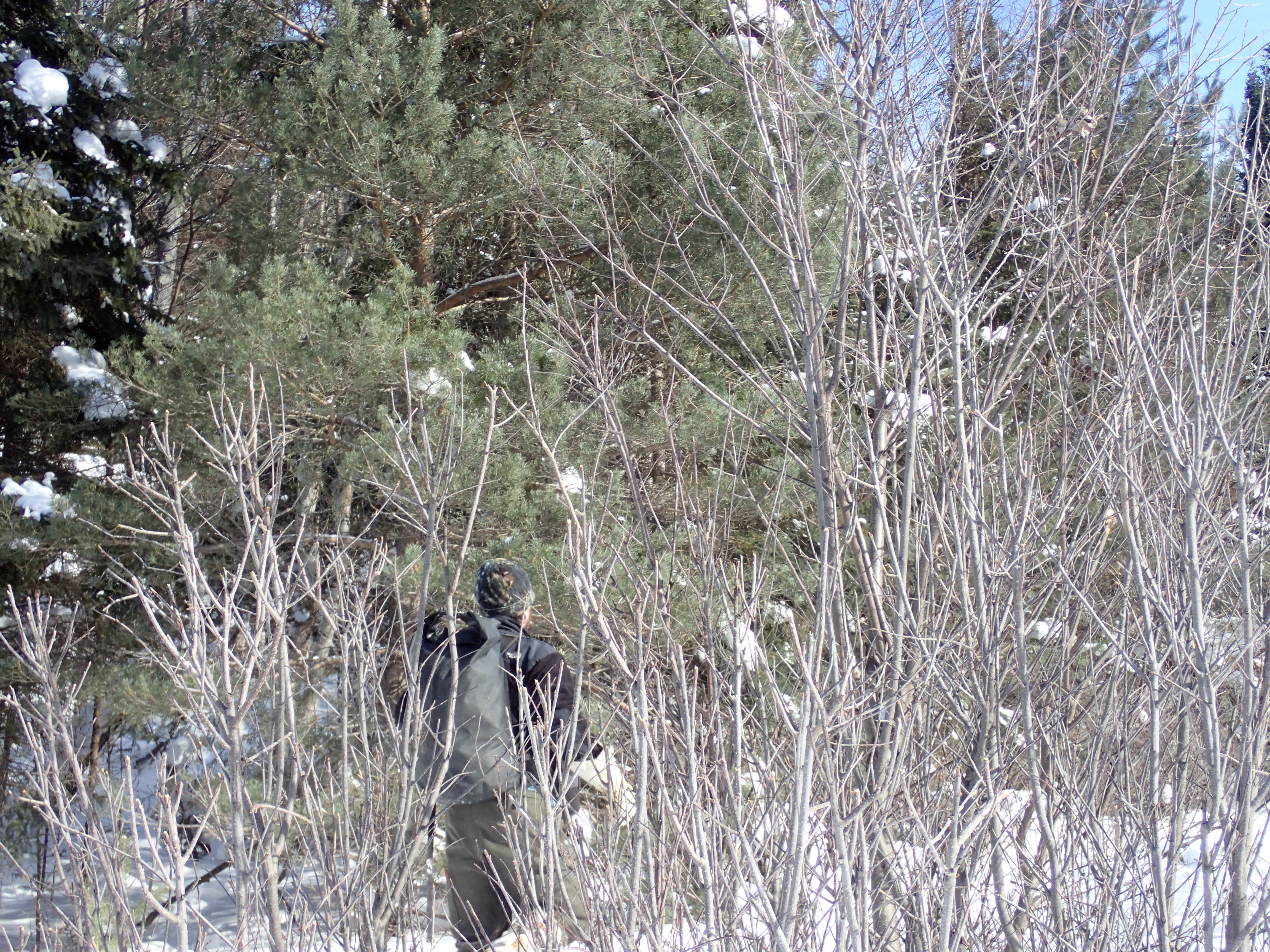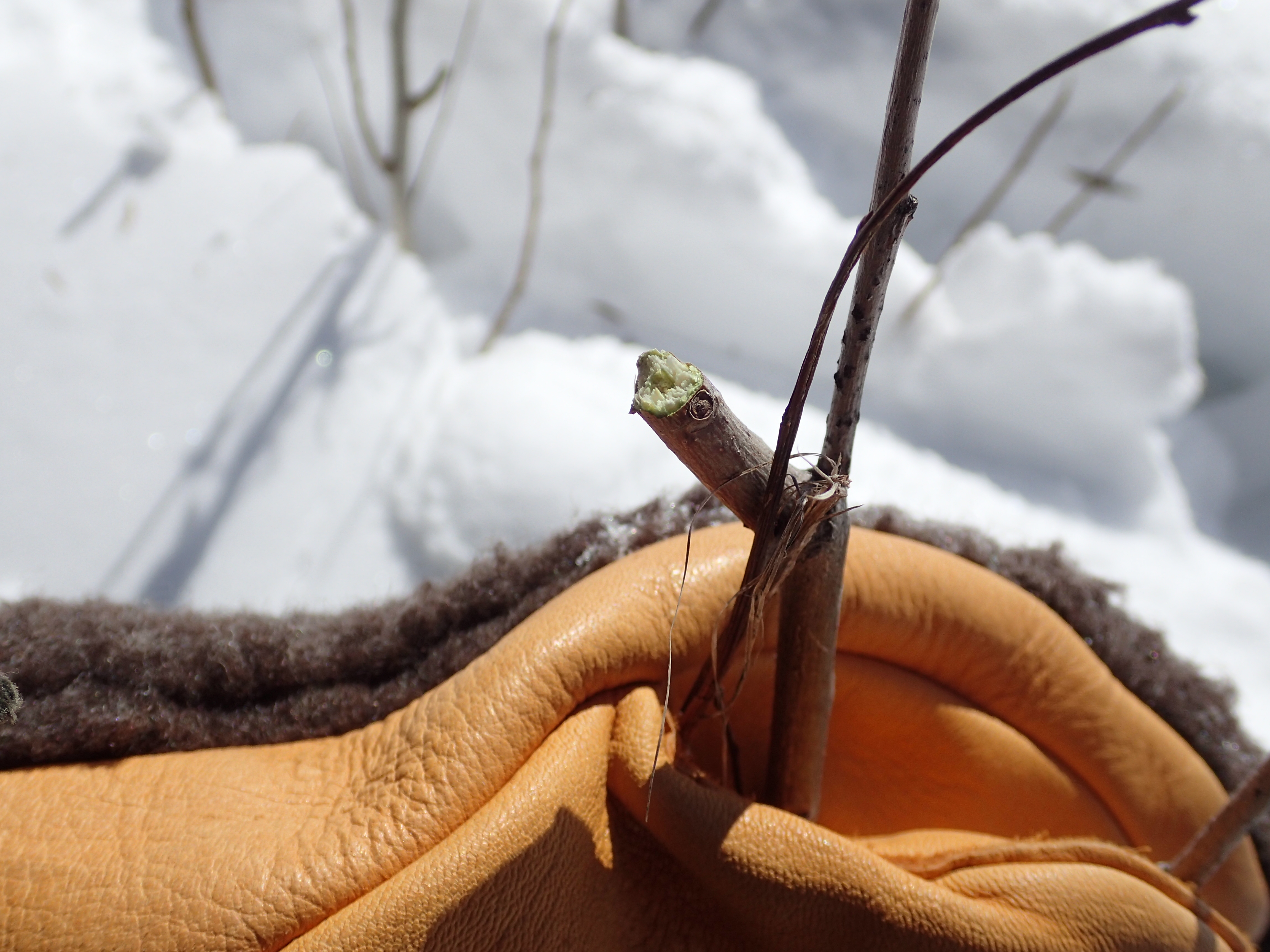 Close up of a moose eaten branch held by my mittened hand. Notice the broken off appearance, deer family, including moose, have no upper incisors and therefor what they bite is more broken or torn than cut. Moose, in winter, can eat up to 45 pounds of twigs, buds and bark a day. An adult bull usually weighs about 1100 pounds (numbers from Mammals of Algonquin Provincial Park published by The Friend of Algonquin Park and converted to pounds by me).
