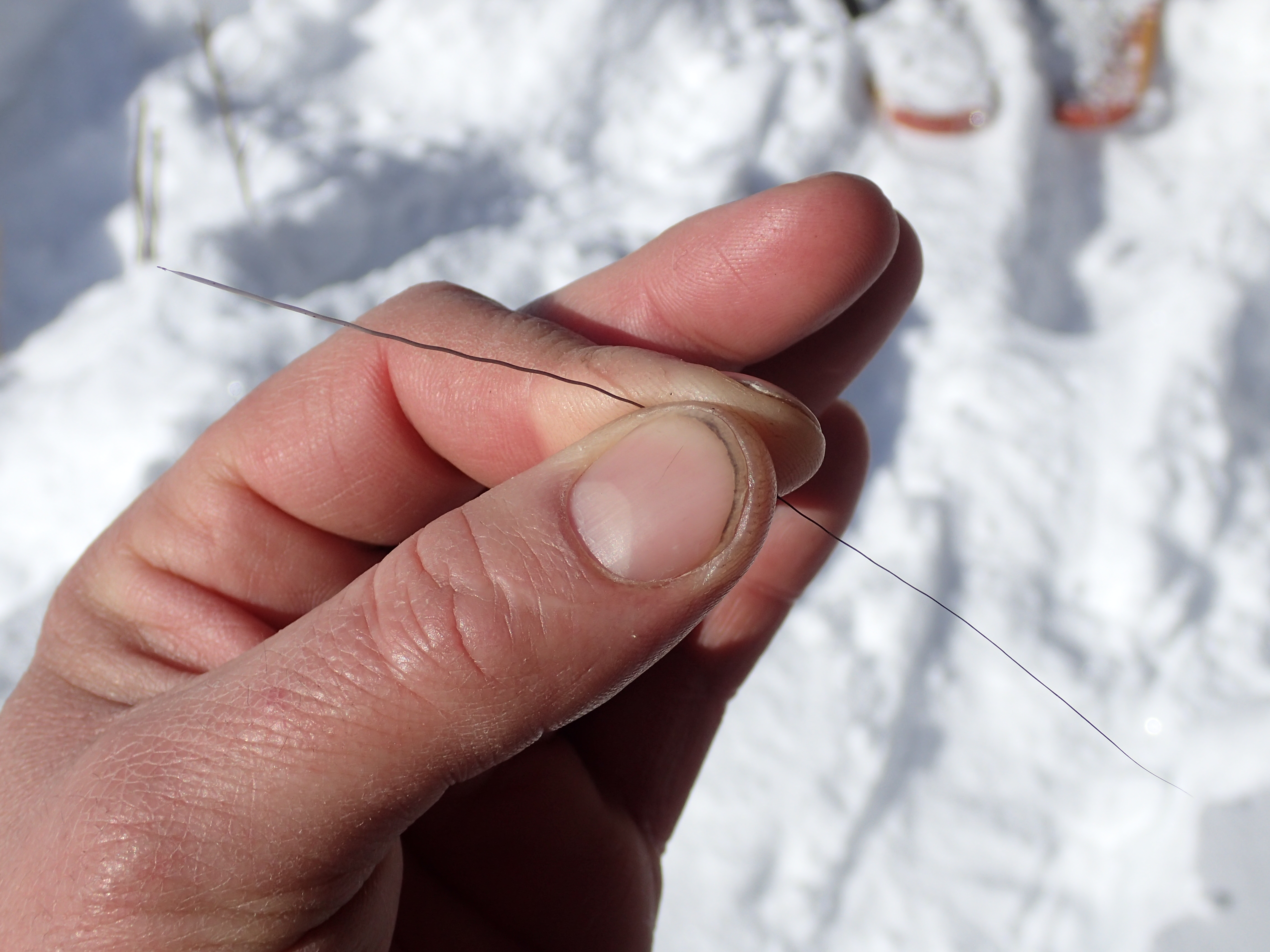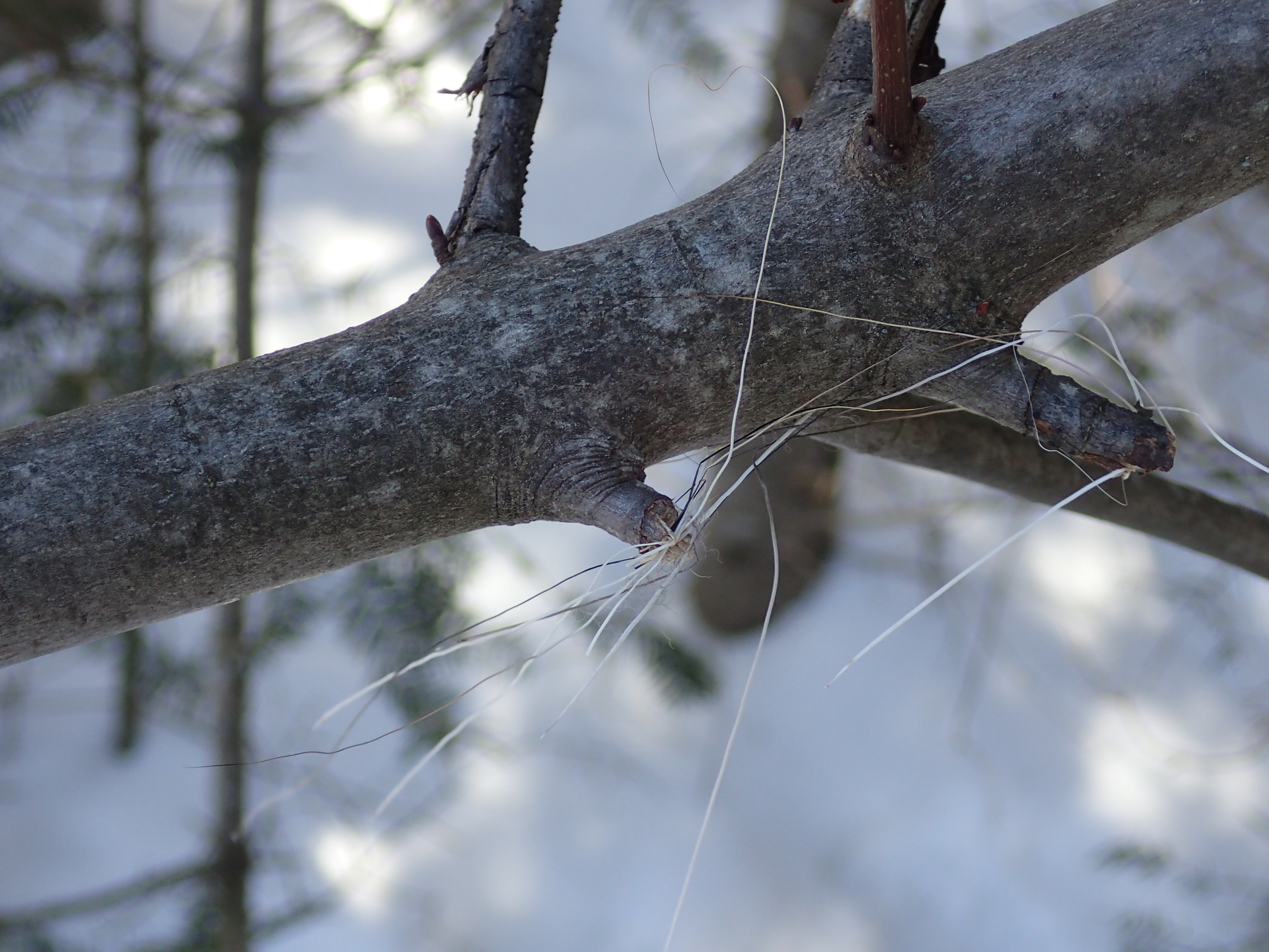 Moose have an interesting way of getting at branches that are taller than they can comfortably reach. They just push the tree over, often straddling it. This tree was fractured under the assault. Below is a closeup of some hair left after the operation.