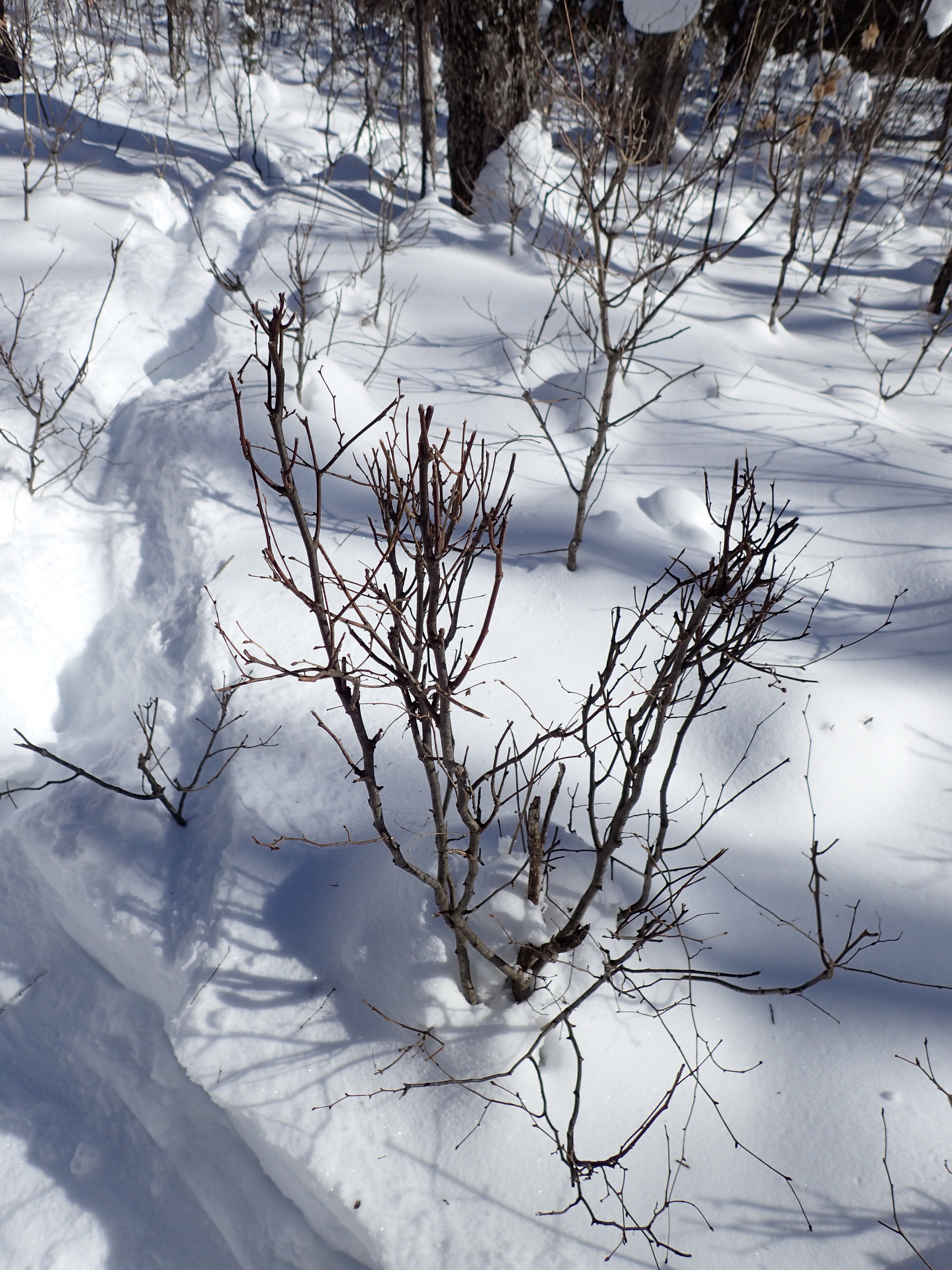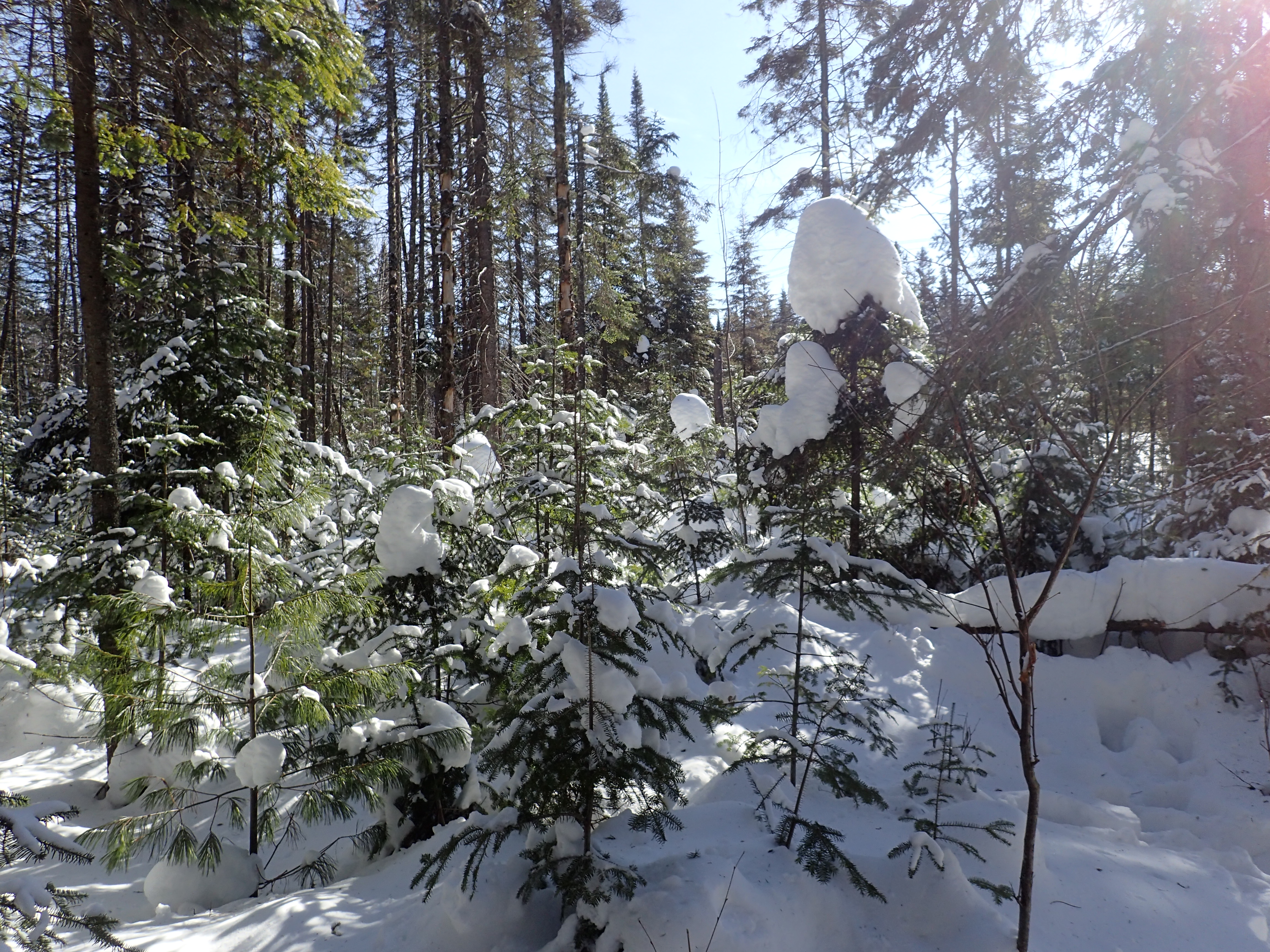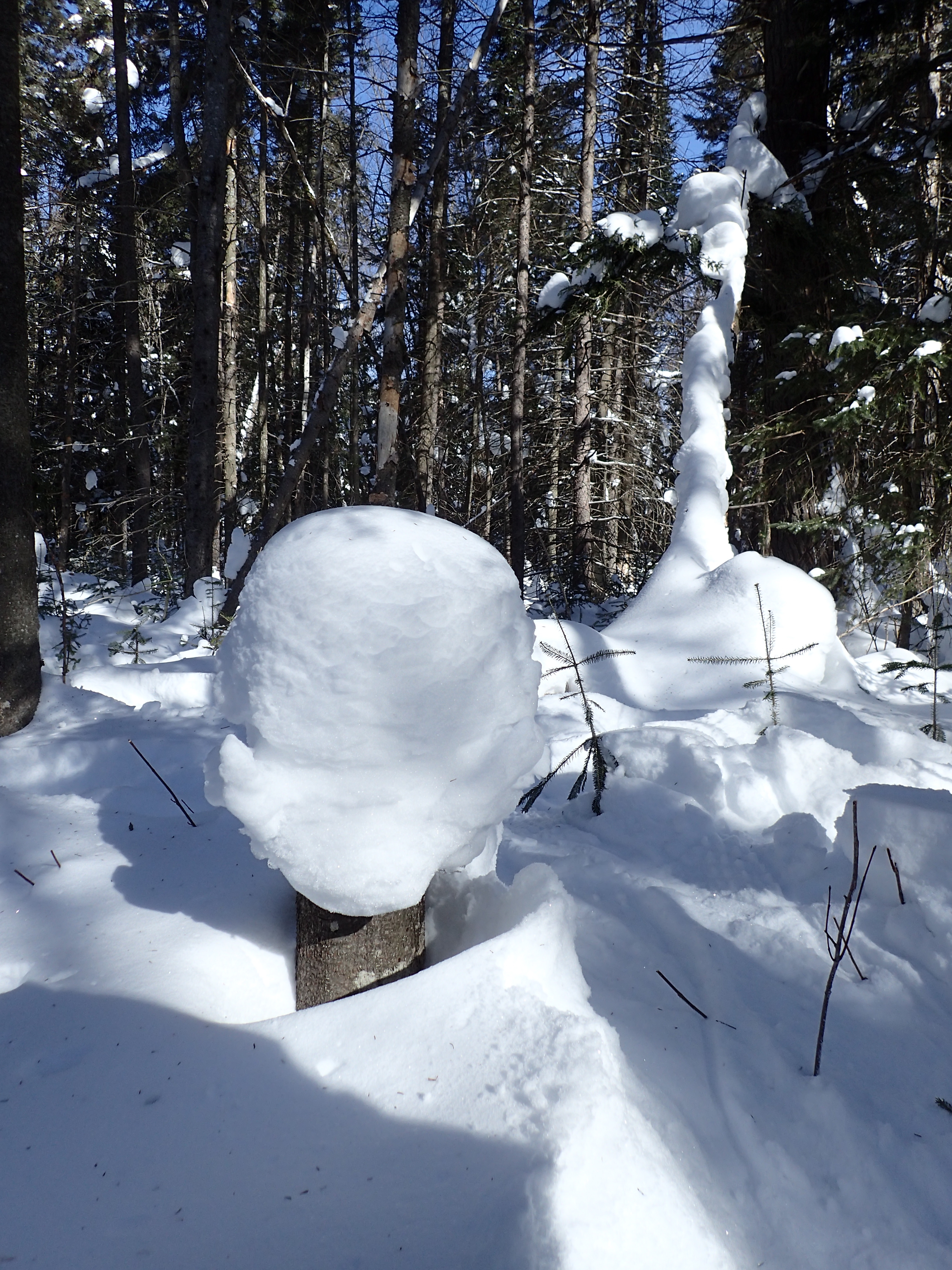 A very snowy forest awaited us. The snow had piled up on everything. Below is one of many stumps that received a mushroom cap of snow. It gave the bush (forest) a surreal and truly Northern feel.